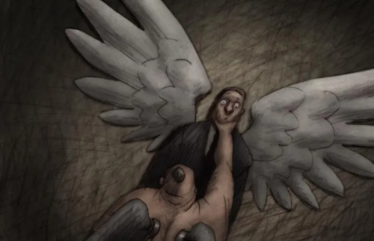 Мультфильм Идиоты и ангелы 2008 раскрывает историю в сюжетной линии как Мрачная комедия о борьбе человека за свою душу. Ангел, эгоистичный и нравственно опустошенный человек, просыпается однажды утром и обнаруживает за спиной крылья. Он пытается спрятать их, но в конце концов все в баре Барта, где герой коротает время, узнают об их существовании и начинают потешаться над смешными отростками....